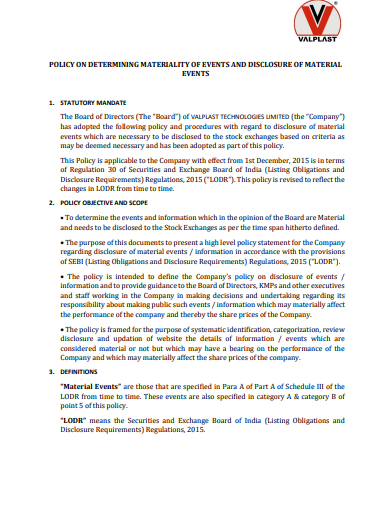 POLICY ON DETERMINING MATERIALITY OF EVENTS AND DISCLOSURE OF MATERIAL EVENTS